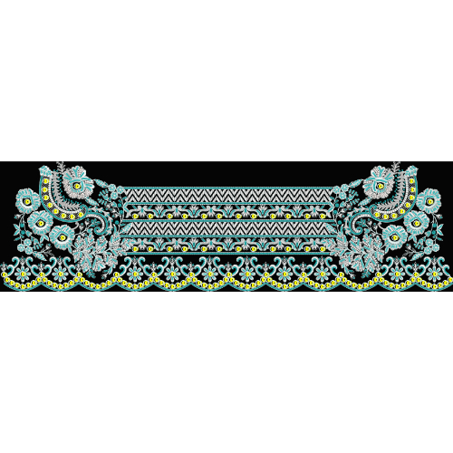 Royalty free floral border embroidery design featuring turquoise and yellow thread work with layered geometric patterns and decorative floral detailing on a black background, perfect for modern and ethnic fashion applications.