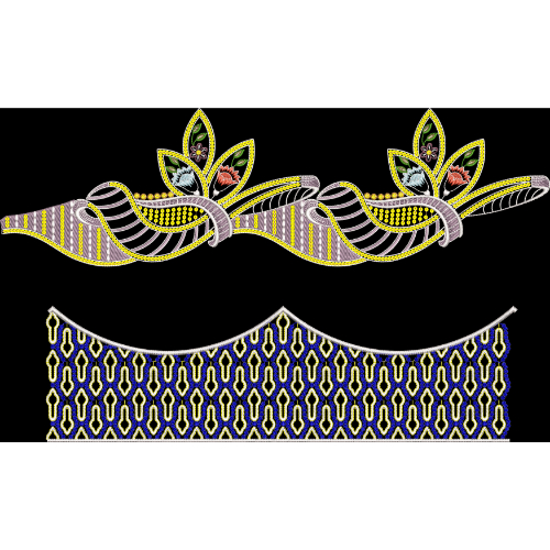 Royalty free floral border embroidery design featuring curved bands, leaf motifs, and geometric patterns with vibrant multicolor thread work.