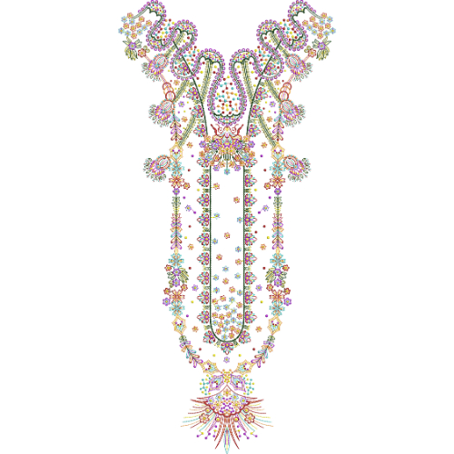 This high-quality royalty free embroidery image showcases an intricate floral neckline embroidery design arranged in a graceful vertical composition on a light background. The design features flowing floral vines, delicate blossoms, ornamental accents, and hanging decorative elements stitched with refined multicolor thread work in soft pastel shades of pink, yellow, green, blue, and gold. Fine stitching textures and balanced symmetry give the embroidery a luxurious and elegant handcrafted appearance. Ideal for women’s fashion, ethnic dresses, kurta and blouse necklines, festive wear, textile printing, digital embroidery applications, and commercial creative projects. Free for personal and commercial use with no copyright restrictions.