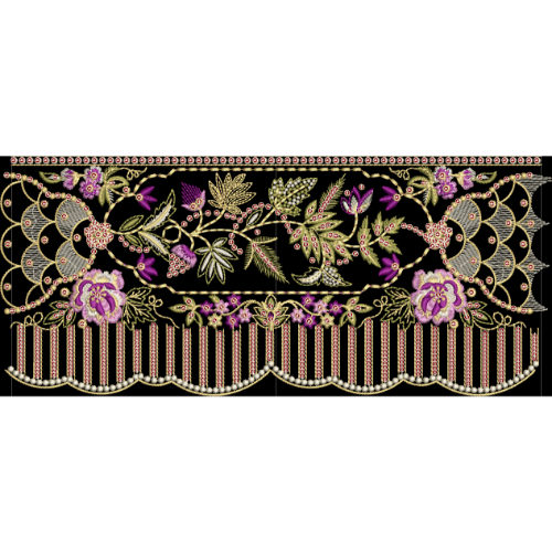 The lower edge of the design is enhanced with a decorative vertical bar lace-style embroidery border, giving the artwork a refined finish suitable for premium garment applications. Fine stitch textures emphasize the handcrafted embroidery look, making the design visually rich and highly detailed.
