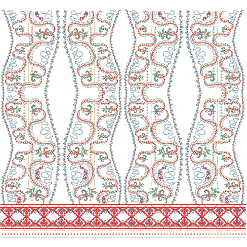 This high-quality royalty free embroidery image showcases a repeating floral vine panel embroidery design arranged in a structured vertical layout. The design features flowing vine patterns, small floral motifs, and ornamental detailing stitched in soft red, blue, and green thread tones on a light background. A contrasting decorative border at the bottom enhances the overall composition and adds a traditional finishing touch. Fine stitching textures and rhythmic repetition give the embroidery a refined handcrafted appearance. Ideal for ethnic garments, kurta and dress panels, dupattas, fabric printing, digital embroidery applications, and commercial creative projects. Free for personal and commercial use with no copyright restrictions.