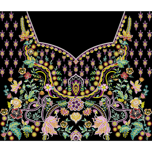 Royalty free heavy neckline embroidery design featuring detailed floral vines, bird motifs, and rich multicolor thread work on a black background.