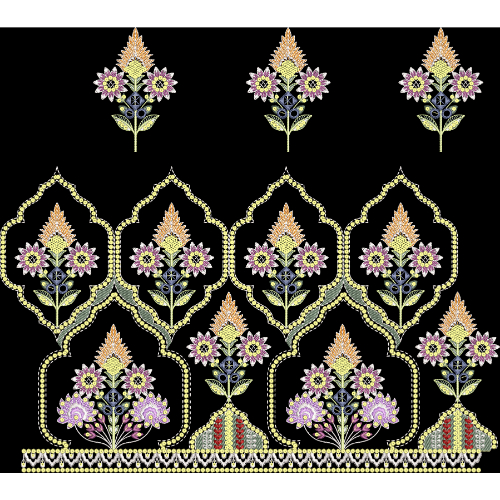 Royalty free Mughal-style butti embroidery design featuring floral motifs arranged in decorative arch frames with elegant multicolor thread work.