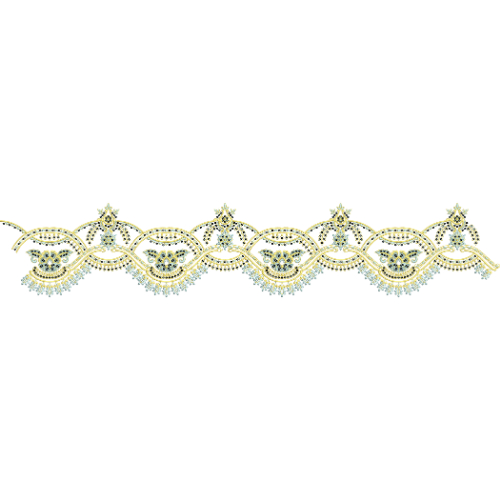 This high-quality royalty free embroidery image showcases a refined ornamental border embroidery design arranged in a continuous horizontal layout on a light background. The design features graceful curved motifs, decorative medallion elements, and delicate bead-style accents stitched with elegant gold thread work complemented by soft pastel highlights. Fine stitching textures and symmetrical repetition give the embroidery a classic and sophisticated appearance. Ideal for ethnic garments, saree and dupatta borders, dress hems, fashion embellishments, textile printing, digital embroidery applications, and commercial creative projects. Free for personal and commercial use with no copyright restrictions.