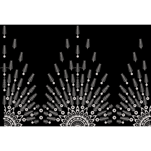 This high-quality royalty free embroidery image showcases a striking ornamental fan-style border embroidery design created with fine white thread work on a black background. The design features radiating fan motifs composed of delicate leaf-like stitches, dotted accents, and symmetrical arrangements that create a bold yet elegant visual effect. Clean stitching textures and rhythmic repetition give the embroidery a refined handcrafted appearance. Ideal for ethnic garments, saree and dupatta borders, statement fashion pieces, textile printing, digital embroidery applications, and commercial creative projects. Free for personal and commercial use with no copyright restrictions.