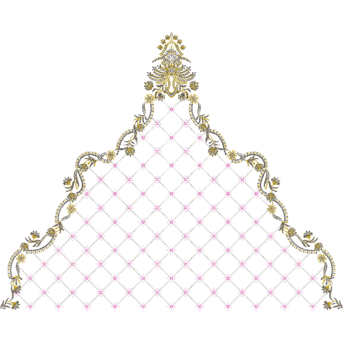 This high-quality royalty free embroidery image showcases an elegant ornamental net embroidery design arranged in a triangular composition on a light background. The design features a delicate lattice net pattern accented with small floral motifs in soft pink tones, framed by ornate gold thread work borders and decorative flourishes. Fine stitching details and symmetrical layout give the embroidery a refined and luxurious appearance. Ideal for bridal dupattas, lehenga panels, saree pallus, ethnic garments, textile printing, digital embroidery applications, and commercial creative projects. Free for personal and commercial use with no copyright restrictions.