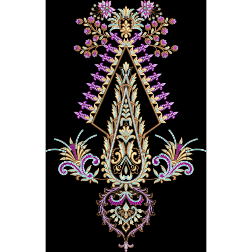 This high-quality royalty free embroidery image showcases an exquisite ornamental panel embroidery design crafted on a black background. The design features a bold triangular central motif enriched with intricate floral patterns, stylized leaves, and decorative ornamental elements stitched with luxury multicolor thread work in shades of gold, purple, teal, blue, and pink. Elegant side flourishes and a finely detailed lower pendant-style motif enhance the regal and artistic appearance of the composition. Fine stitching textures, symmetrical balance, and rich detailing make this embroidery ideal for ethnic garments, designer panels, bridal and festive wear, textile printing, digital embroidery applications, and commercial creative projects. Free for personal and commercial use with no copyright restrictions.