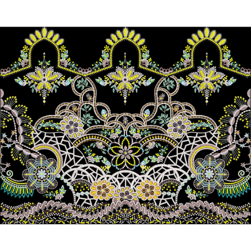 Royalty free ornamental border embroidery design featuring layered floral motifs, geometric web patterns, and refined multicolor thread work on a black background.