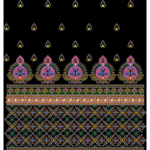 Royalty free traditional floral border embroidery design featuring rich multicolor thread work on a dark background. Ideal for ethnic wear, festive garments, and textile projects.