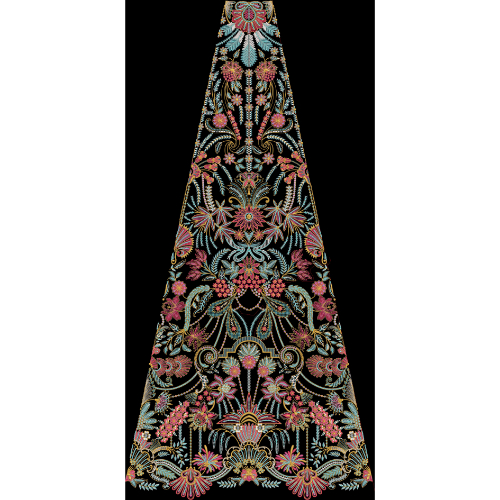 This high-quality royalty free embroidery image showcases an elaborate triangular panel embroidery design crafted with intricate floral and ornamental elements. The composition is structured in a tapered triangular silhouette, filled with richly layered flowers, stylized leaves, scrolling vines, and decorative fillers arranged in perfect symmetry. The dense embroidery work creates a luxurious, statement-making panel suitable for premium garments.