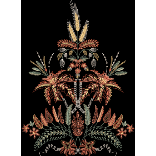 Delicate stitch-like detailing defines every leaf, petal, and decorative element, giving the artwork a handcrafted embroidered appearance with depth and texture. Curved stems and balanced botanical arrangements create harmony and visual flow, while small floral accents at the base add refinement and softness to the overall structure.