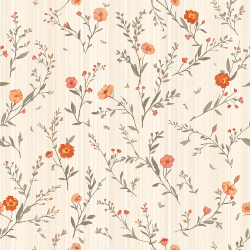 This elegant seamless pattern showcases a delicate botanical arrangement of wildflower stems illustrated in a soft watercolor style. The design features scattered blossoms in warm rust orange, coral, and soft peach tones that create a natural and inviting floral palette. Each flower is carefully painted with layered petals and subtle shading, giving the pattern a hand-painted botanical appearance.
