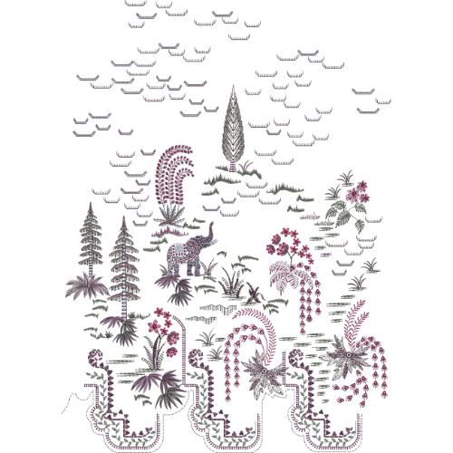 Scenic Botanical Landscape Embroidery Style Textile Print Design