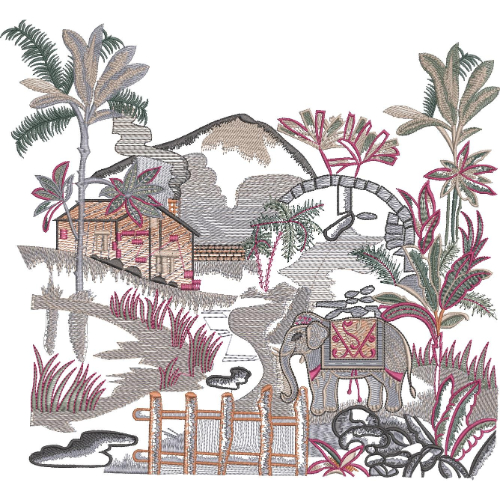 Scenic Landscape Embroidery Design with Elephant, Hut, and Tropical Foliage