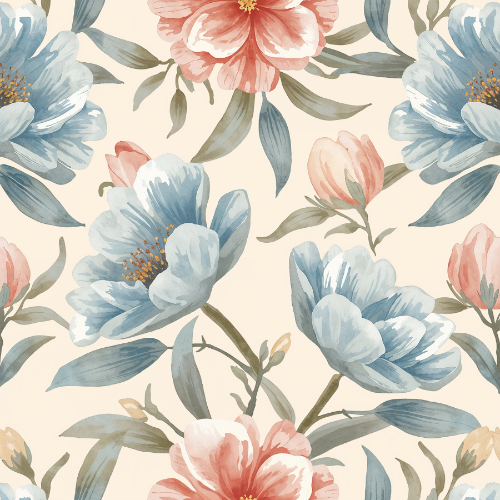 This elegant seamless floral pattern features large peony-style blossoms illustrated in a soft watercolor botanical style. The design showcases beautifully layered flowers in calming blue tones paired with warm coral and peach blossoms, creating a balanced and harmonious floral palette. Each flower is carefully illustrated with soft gradients and delicate petal textures that give the blossoms a natural hand-painted appearance.