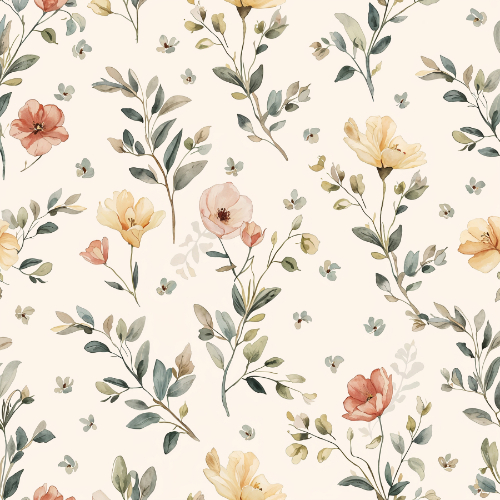 This elegant seamless pattern features a gentle arrangement of wildflowers and botanical foliage illustrated in a soft watercolor style. The design showcases delicate blossoms in warm peach, soft coral, and pale yellow tones that create a calm and natural floral palette. Each flower is illustrated with lightly layered petals and subtle watercolor shading that gives the blossoms a refined hand-painted appearance.