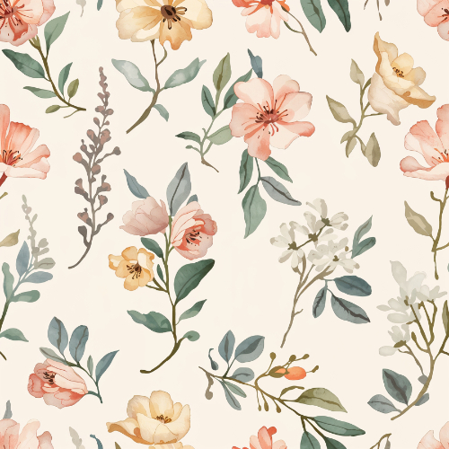 This elegant seamless floral pattern features a graceful arrangement of wildflowers illustrated in a soft watercolor botanical style. The design showcases delicate blossoms in gentle pastel tones including peach, soft coral, warm cream, and muted yellow. Each flower is illustrated with light layered petals and subtle shading, giving the blossoms a natural hand-painted appearance.