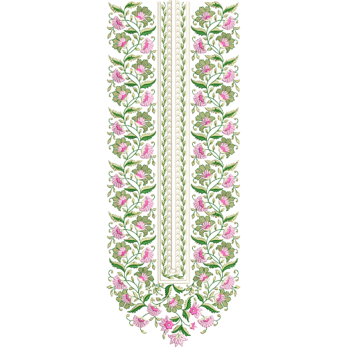 A narrow decorative central panel runs vertically through the design, bordered with subtle ornamental detailing that adds structure without overpowering the floral elements. At the lower section, the floral vines converge into a graceful bouquet-style finish, completing the neckline composition with harmony and visual softness.