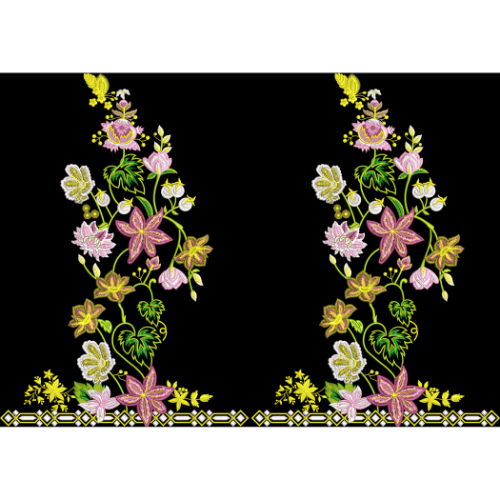 This textile print features a refined and symmetrical floral border composition inspired by traditional embroidery techniques. The design displays two mirrored floral vine arrangements rising gracefully from a decorative base border, making it ideal for saree pallus, dupatta edges, shawls, and elegant garment borders.