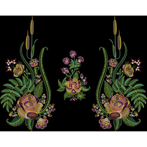 A refined embroidery-style panel design featuring symmetrical floral arrangements with roses, leafy stems, and hanging bud elements in vibrant pink, green, and gold tones on a black background.