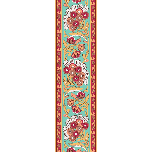 Image resolution / 300 DPI + High Resolution JPG A classic vertical floral border design featuring Mughal-inspired flowers and flowing vines. The vibrant turquoise base combined with red, beige, and golden tones makes this print ideal for fabric borders and decorative textile applications.