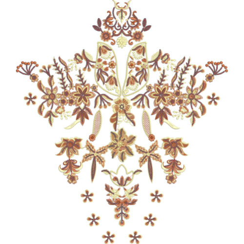 This traditional floral ornamental neckline embroidery design features a beautifully balanced composition inspired by classic ethnic patterns and decorative botanical artistry. The design is arranged in a symmetrical neckline layout with intricate floral and ornamental elements that create a refined and visually rich garment front.