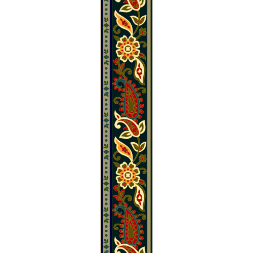 A classic vertical floral border textile design featuring paisley motifs and flowing vines. The dark green base with red, cream, and gold accents makes this print ideal for ethnic apparel and decorative fabric borders.