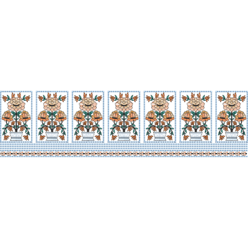 A repeating floral panel border design featuring peach-toned flowers in decorative pots, framed with a soft blue grid pattern and a delicate ornamental lower border.