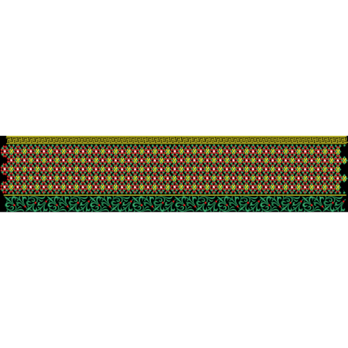 The color palette combines bright red, green, yellow, and black tones, producing a vibrant and culturally rich appearance. Fine stitch-like detailing enhances the handcrafted embroidery effect, while the contrasting top and bottom ornamental trims add structure and definition to the overall design.