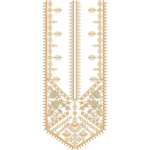 This neckline embroidery design features a structured and symmetrical composition that combines geometric precision with subtle floral ornamentation. The design is built around a long vertical panel defined by fine linear patterns and repeating angular motifs, creating a strong and organized visual flow. The central strip is enhanced with small triangular and diamond-like elements that add texture and rhythmic continuity.