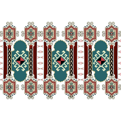 A bold traditional panel-style border textile design featuring geometric and tribal-inspired motifs. The teal base with red, black, and cream accents makes this print ideal for ethnic apparel and decorative fabric borders.