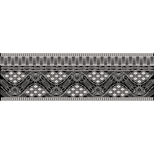 Rendered in a monochrome black-and-white palette, the design emphasizes contrast and highlights the intricate stitch-like linework. Layered geometric bands and symmetrical motifs give the border a strong architectural presence while maintaining a handcrafted embroidery feel. The repetition and precision of the pattern make it versatile for both ethnic and contemporary textile applications.