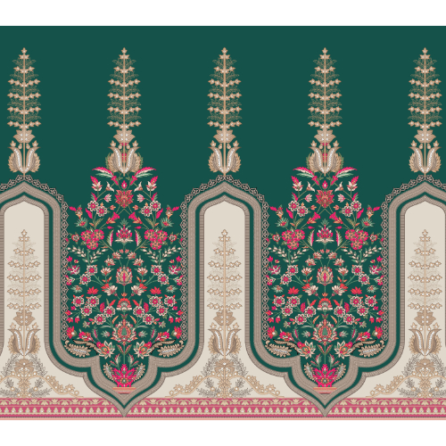 An elegant Mughal-inspired textile panel design featuring floral bouquets arranged within arched frames. The deep green background with pink, beige, and gold accents makes this print ideal for premium ethnic apparel and luxury fabrics.