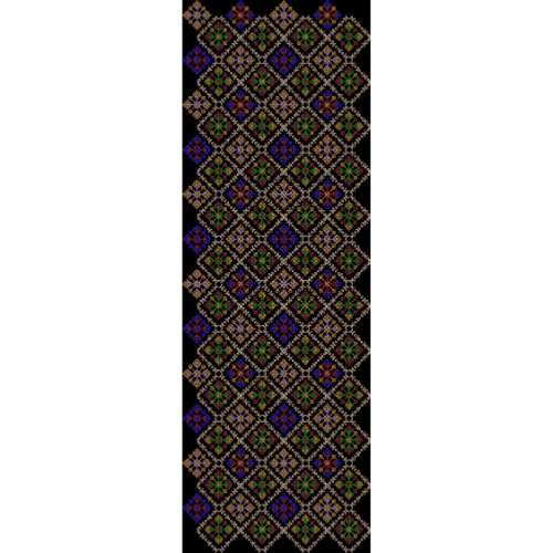This elegant textile print showcases a vertically arranged all-over geometric pattern inspired by traditional embroidery and ethnic surface design. The composition features repeating diamond-shaped motifs, each filled with small floral elements, creating a rich and rhythmic visual texture.