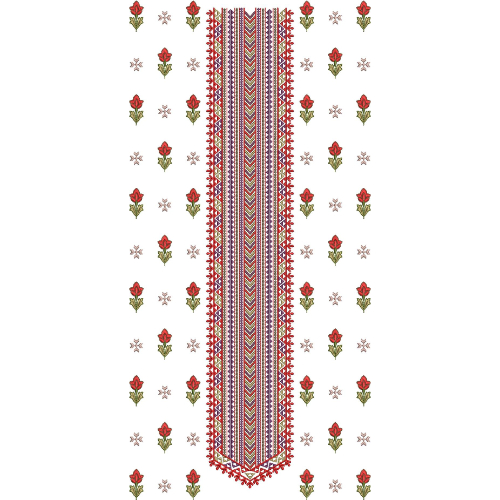 This traditional multicolor long neckline embroidery design features a vibrant combination of geometric patterns and delicate floral motifs arranged in a sleek vertical panel layout. The design is crafted to enhance the front of garments with a balanced and symmetrical composition, offering a rich ethnic and contemporary look.