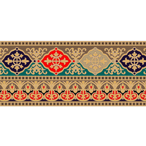 Below the main band, a secondary border displays stylized floral forms and repeating ornamental shapes, rendered in red, gold, and beige tones. Fine line detailing and symmetrical repetition give the design a balanced and refined appearance.