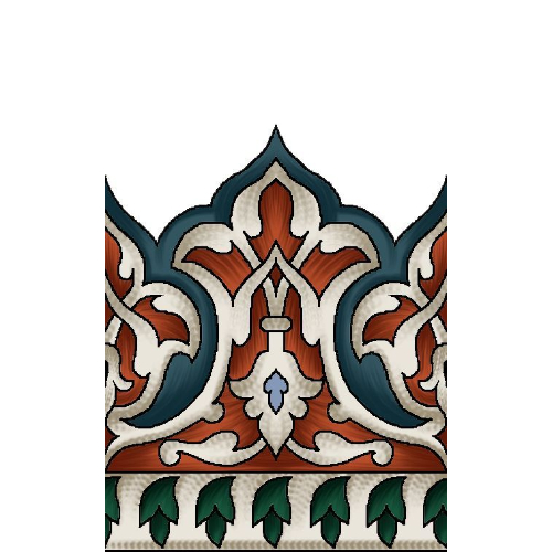 This textile print highlights a traditional ornamental border motif inspired by classical South Asian and Middle Eastern decorative patterns. The composition features a symmetrical arrangement of curved arches and stylized floral forms, giving the design a bold yet elegant appearance.