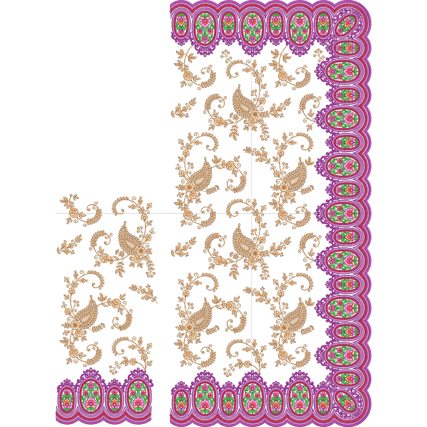 The contrast between the subtle, finely detailed inner motifs and the richly colored, heavy border creates a perfect balance between sophistication and festivity. This design is highly suitable for traditional sarees, bridal wear, and festive garments, where both intricate detailing and bold decorative elements are desired.