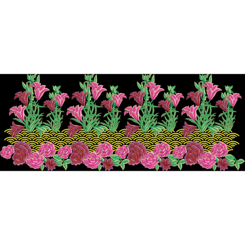 Vibrant Embroidered Floral Border with Lily and Rose Motifs on Black Background