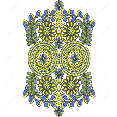 This striking embroidery design presents a symmetrical composition built around bold circular medallions and stylized floral elements. At the center, two prominent round motifs feature intricate zigzag and concentric patterns, creating a strong geometric focal point. Each circular element is enhanced with fine stitch detailing that adds texture and depth, making the design visually dynamic.