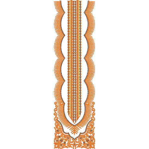 This neckline embroidery design features a bold elongated panel composition enhanced with scalloped borders and intricate ornamental detailing. The structure is built around a long vertical neckline panel that creates a strong and elegant silhouette, making it ideal for traditional and festive garments. The central panel is filled with fine linear and geometric patterns arranged in parallel alignment, adding texture and visual depth while maintaining a clean structured appearance.