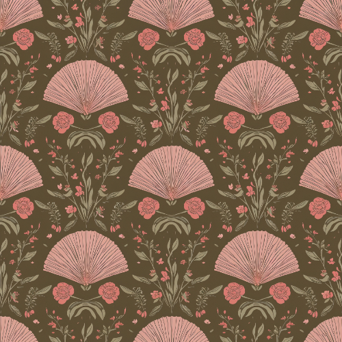 The combination of structured fan shapes and organic floral elements creates a sophisticated balance between geometric ornamentation and natural botanical forms. The pattern follows a repeating layout that ensures smooth continuity when tiled across larger surfaces, making it ideal for seamless surface design applications.