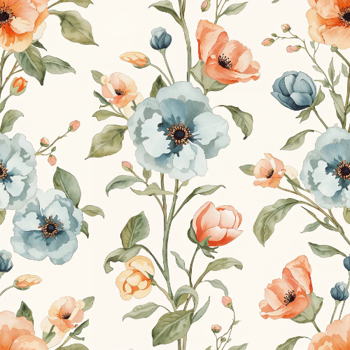blue peach floral pattern, vintage botanical seamless design, watercolor flower repeat pattern, elegant floral textile print, garden floral fabric design, botanical flower surface pattern, pastel botanical repeat design, cottage garden floral pattern, decorative flower seamless design, botanical floral textile
