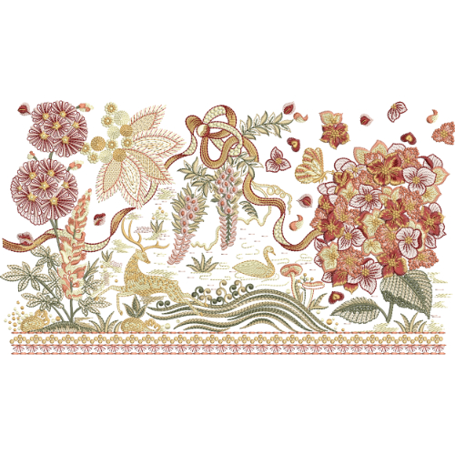 Flowing ribbon motifs weave gracefully through the floral arrangement, adding movement and elegance to the design. Subtle scenic elements, including stylized water waves and botanical ground textures, enhance the storytelling quality of the composition. Fine stitch-like detailing throughout the artwork creates an authentic hand-embroidered appearance with depth and texture.