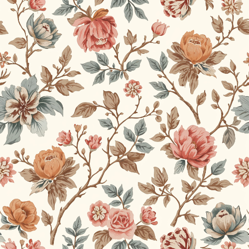 The flowers vary in size, with larger statement blossoms balanced by smaller floral accents and buds that add detail and movement. The botanical branches weave gracefully across the design, forming a balanced arrangement that repeats smoothly across surfaces. The warm vintage color palette combined with delicate botanical illustration gives the pattern a timeless and decorative aesthetic.