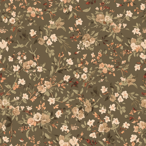 The color palette blends earthy brown tones with soft peach, beige, and muted green botanical shades, creating a warm and rustic floral aesthetic. The vintage-inspired botanical style gives the pattern a timeless countryside charm suitable for classic, cottage-style, and nature-themed design collections.