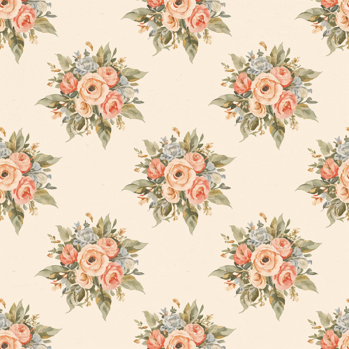 The color palette combines soft peach, warm coral, creamy ivory floral tones, and subtle green botanical hues, resulting in a timeless floral style that feels elegant and versatile. The gentle watercolor-inspired detailing adds a hand-painted artistic quality, making the pattern ideal for romantic, vintage-inspired, and botanical themed design collections.