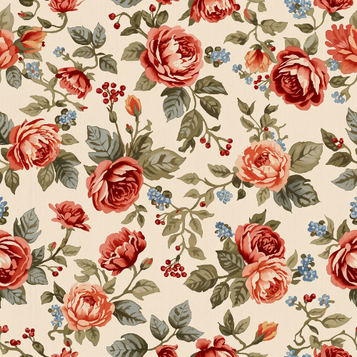 The color palette blends rich red roses, coral blossoms, muted green foliage, and small blue floral accents, producing a timeless vintage garden aesthetic. The classic botanical illustration style makes the pattern suitable for traditional, romantic, and decorative design themes.