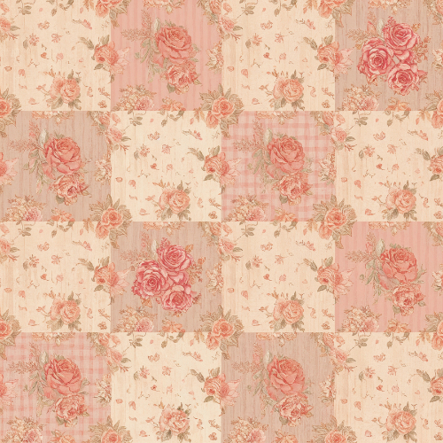 This seamless pattern showcases a beautiful patchwork-style composition featuring romantic rose illustrations arranged in quilt-like squares. The design blends floral motifs with classic textile-inspired patterns, creating a warm vintage aesthetic reminiscent of traditional quilt fabrics.