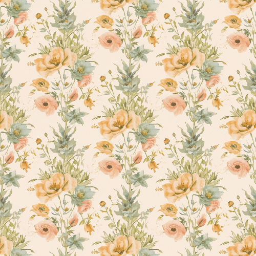 The balanced layout allows the floral clusters to repeat seamlessly across surfaces while maintaining a soft and elegant visual rhythm. The watercolor illustration style and pastel botanical palette give the pattern a timeless vintage garden aesthetic.